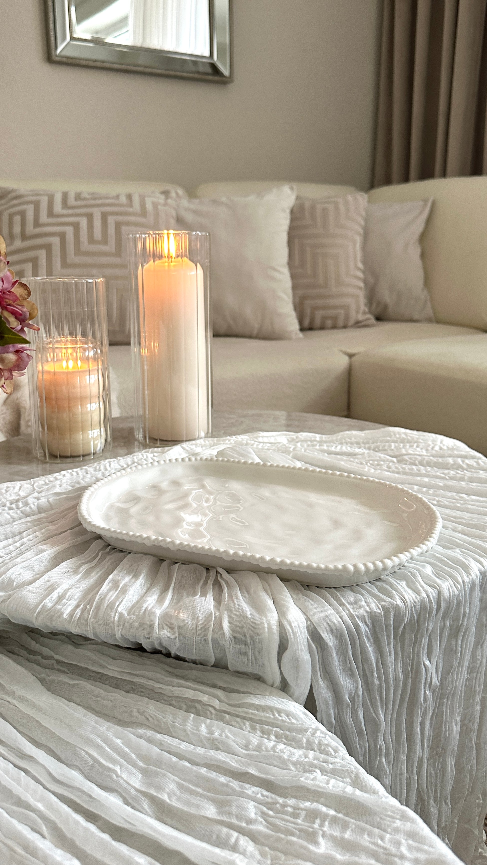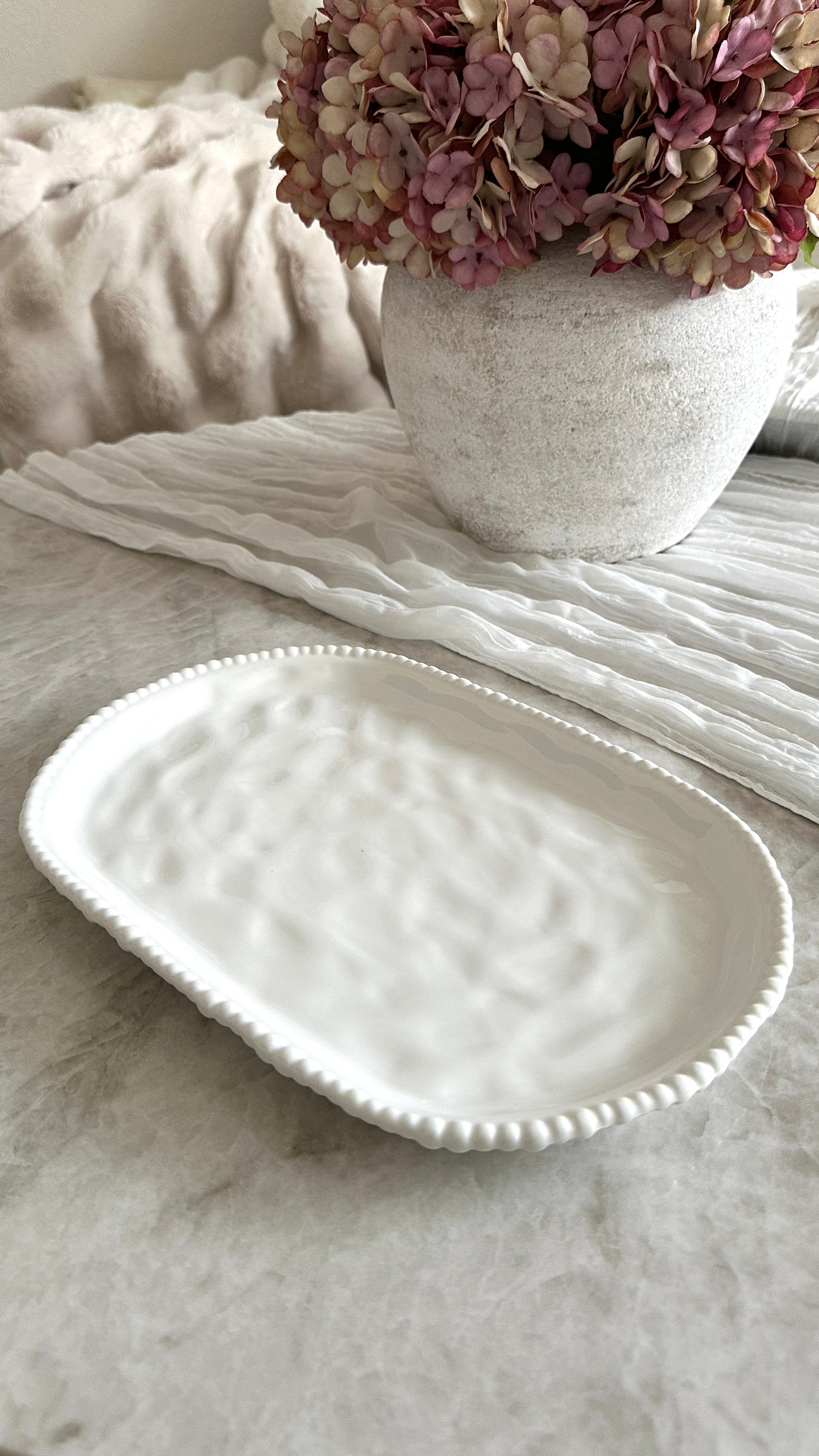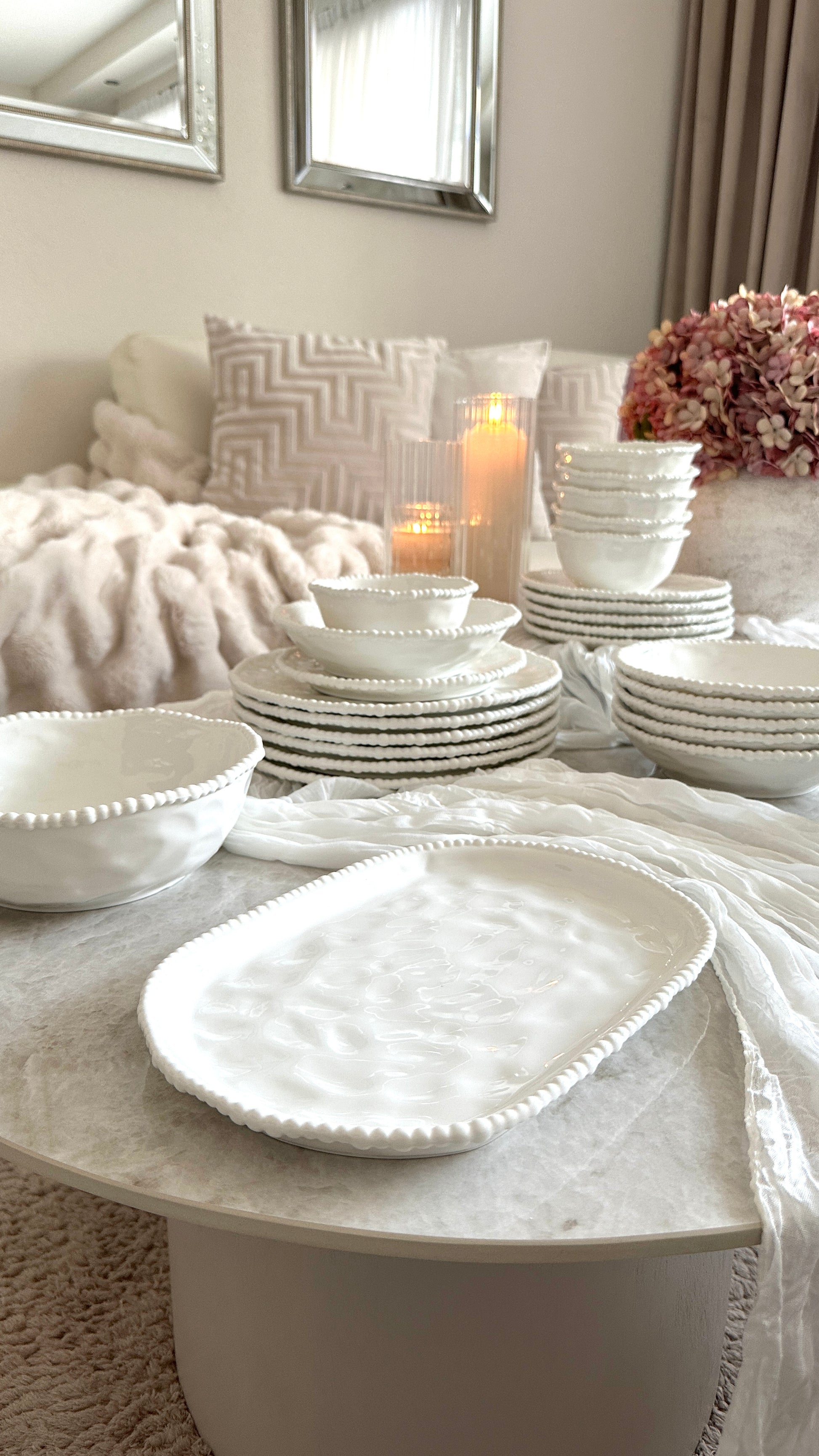 Die Pearly Servierplatte überzeugt durch ein schlichtes, zeitloses Design mit feiner Perlenstruktur am Rand. Die klare, helle Farbgebung sorgt für ein ruhiges Gesamtbild und lässt sich perfekt mit der Pearly Kollektion kombinieren.